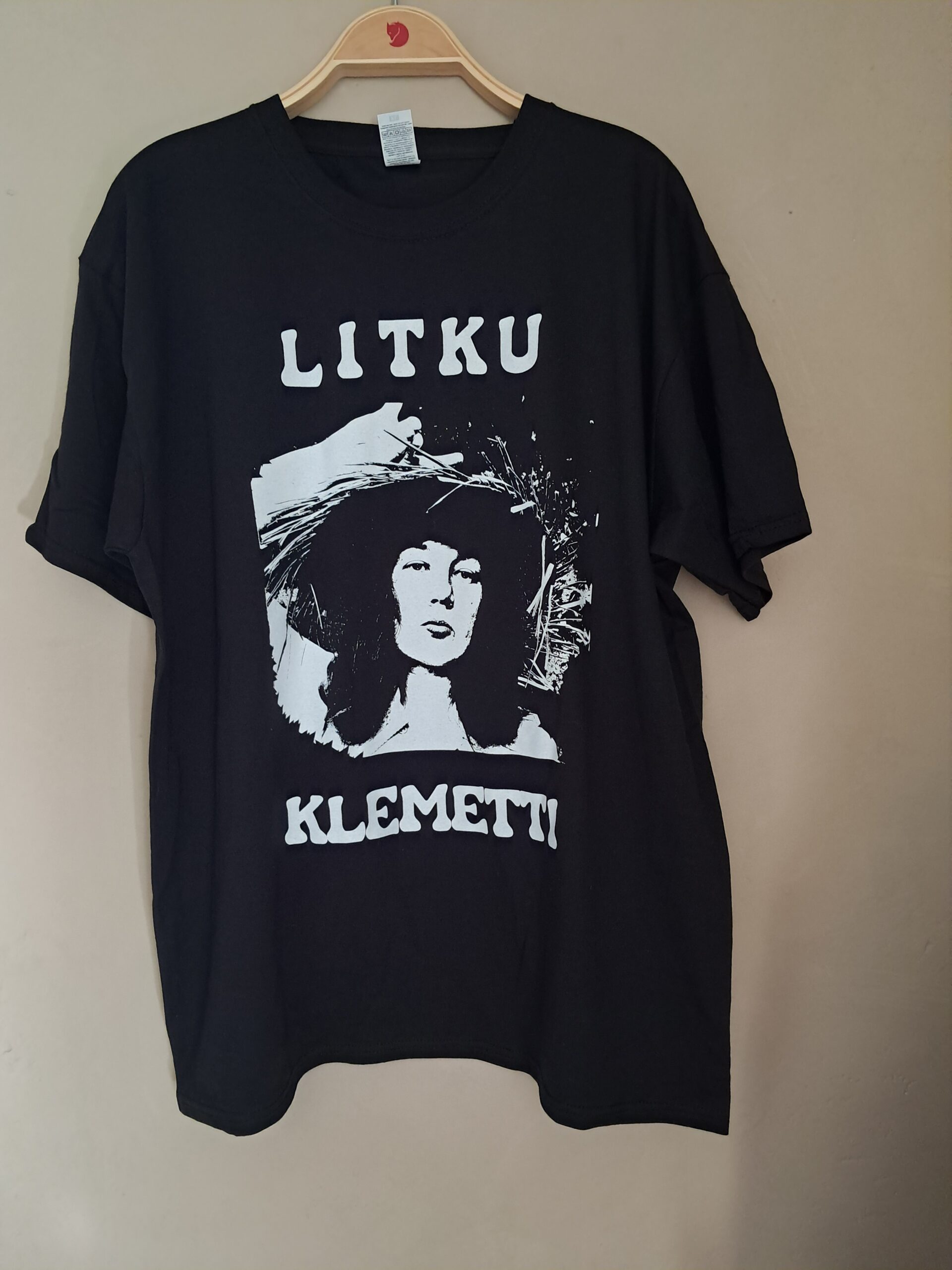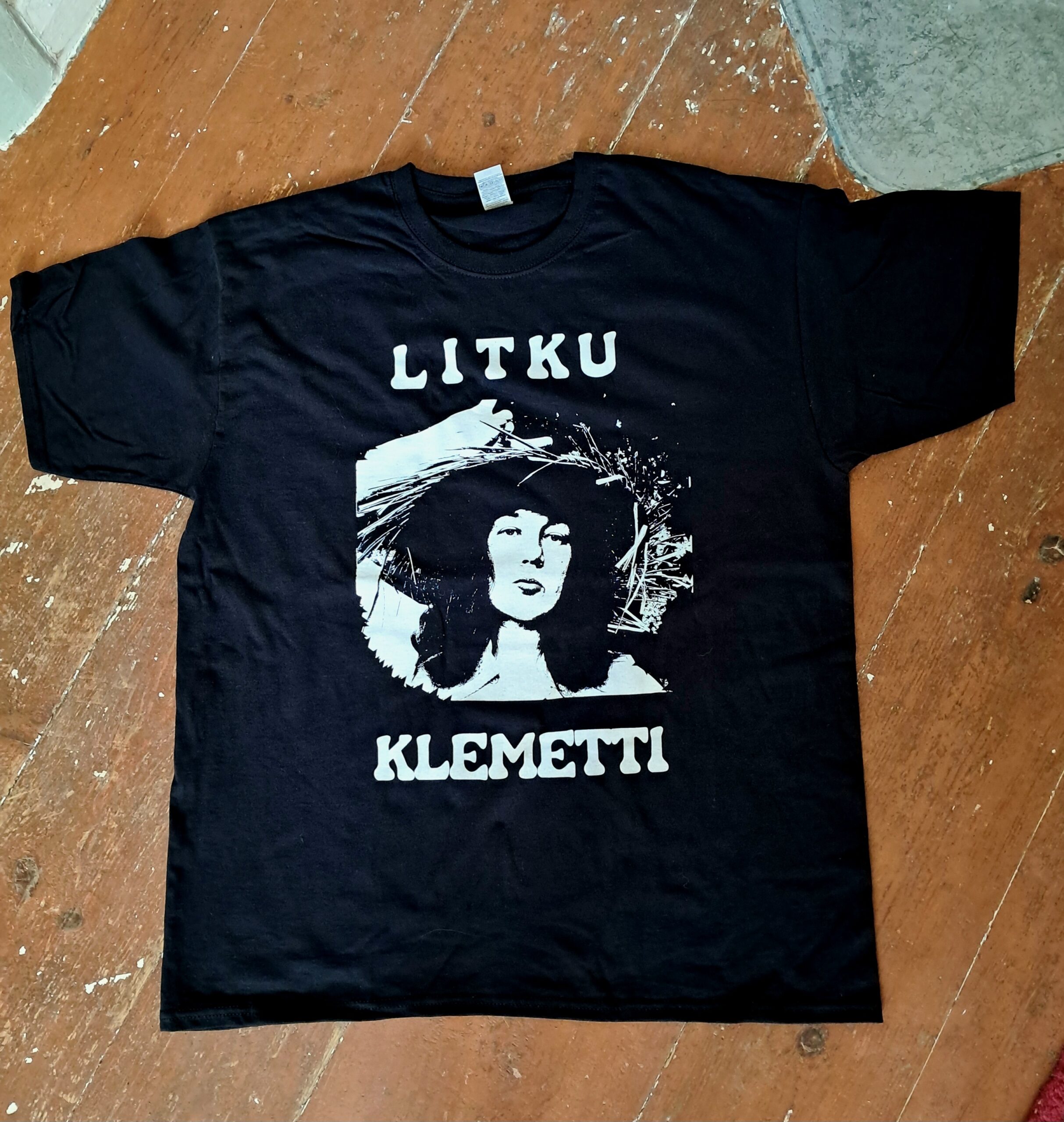 Silkkipainettu musta t-paita valkoisella printillä.